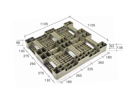 進叉方向:四面進叉(4 Way)尺寸:1100 x 1100 x 138 毫米 / 1200 x 1100 x 138 毫米靜態承重:3000 公斤動態承重:1000 公斤上架承重:300公斤材質:聚丙烯(P.P.)/聚乙烯(P.E.)製程:一體成型用途:出口、倉儲